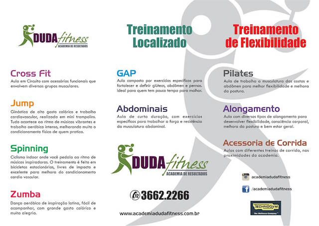 Duda Fitness com mais de 10 anos no mercado agora oferece um espaço totalmente novo e com equipamentos italianos de ultima geração para musculação. Aulas de ginástica, zumba, jump, pilates, fisioterapia, artes marciais, spinning e muito mais